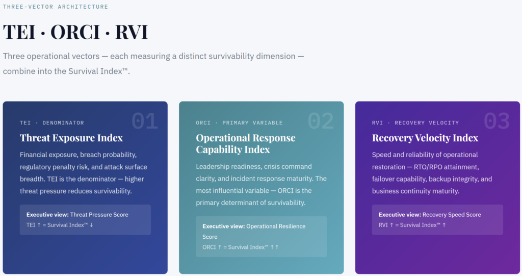 - TEI (Threat Exposure Index): The Threat Pressure (Denominator). This measures the organization’s financial exposure, breach probability, regulatory penalty risk, and attack surface breadth. High threat pressure heavily penalizes the overall survivability score, requiring exceptional ORCI and RVI to compensate.