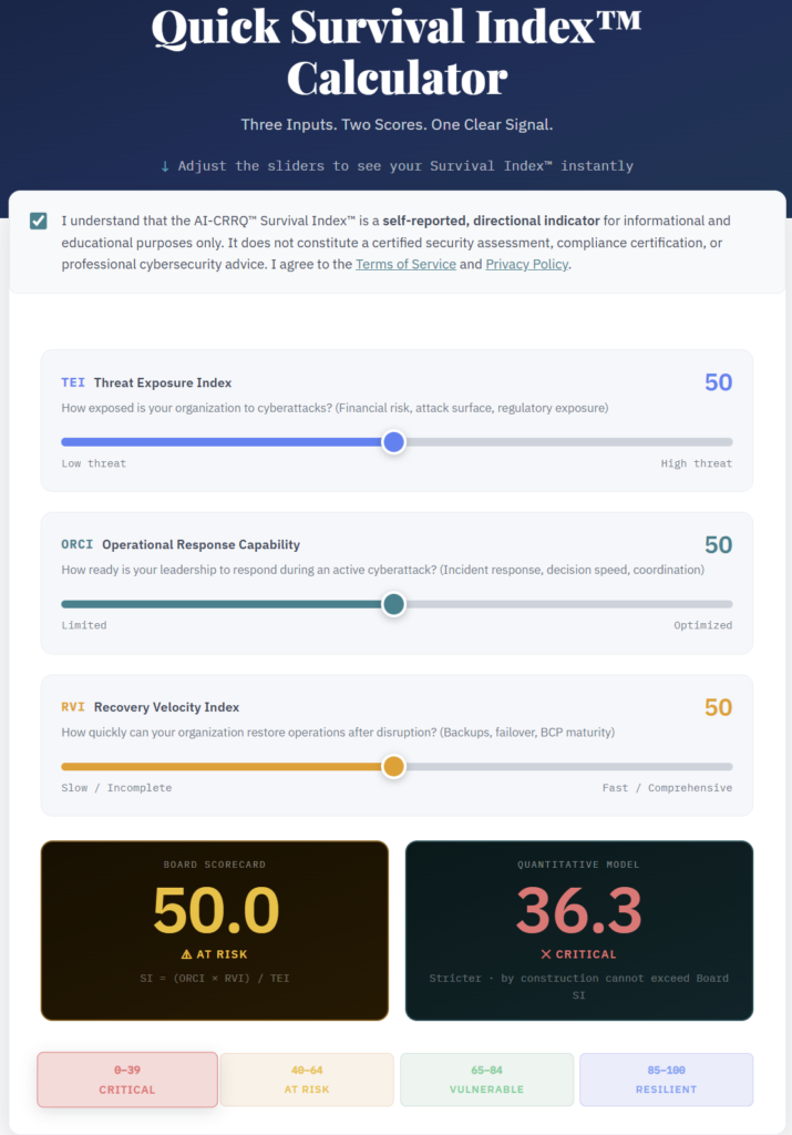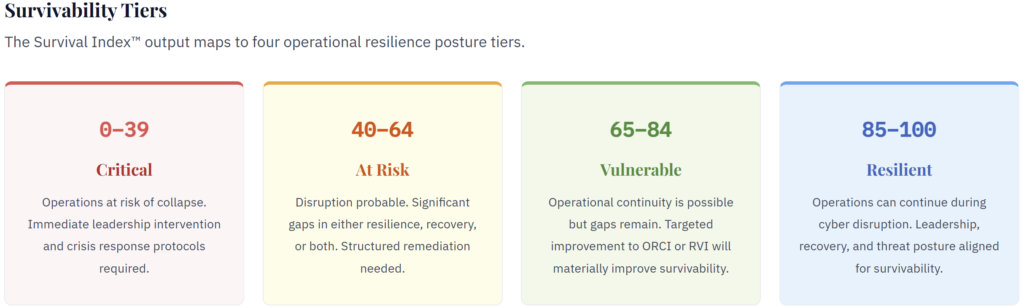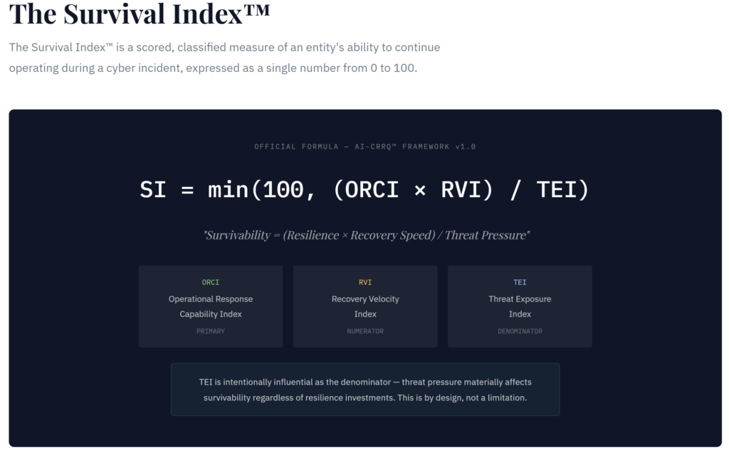 The central output of the AI-CRRQ™ framework is the Survival Index™ (SI). This is a directional metric—scaled from 0 to 100—that calculates an organization’s operational resilience posture based on three primary vectors: